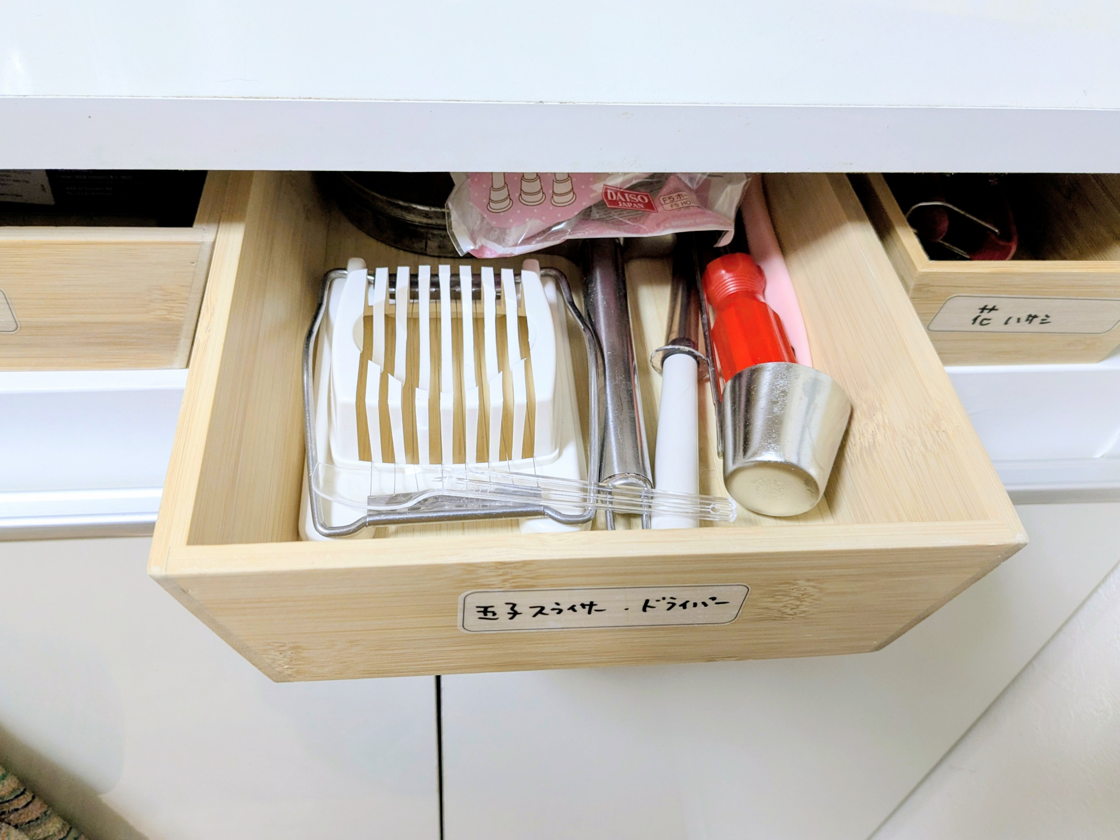 ( ↑ 調理小道具の引き出しは、「玉子切るやつどこいったんや?」とシゲさんが絶対に聞いてくる玉子スライサーと、ちょくちょく緩んでしまうお鍋の取っ手のネジをしめるドライバーをラベルに書きました )