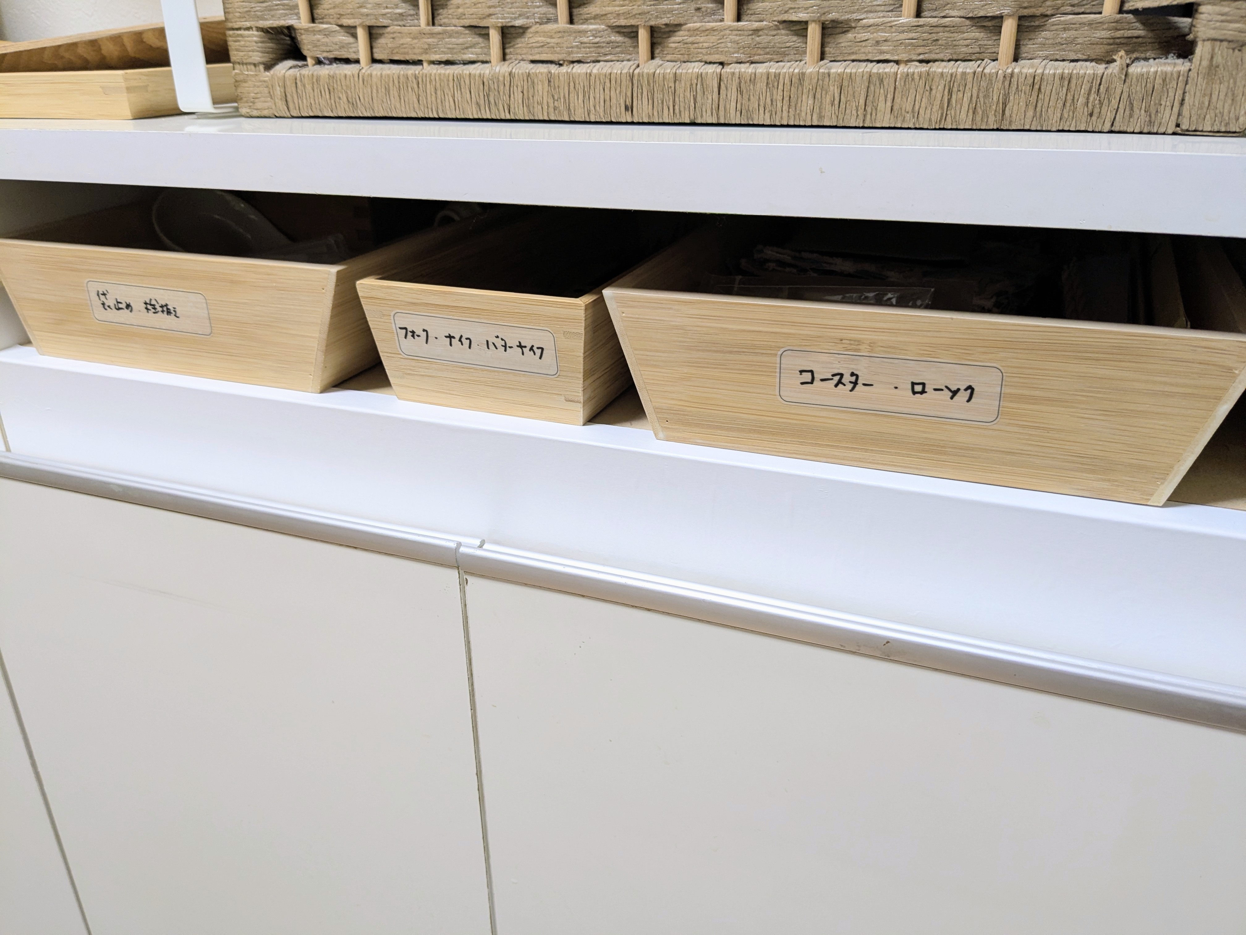 食器棚の壊れかけていた引き出しも捨て、そこにIKEAで買った竹製のボックスを入れました。毎日必ず触るところがスムーズになると地味にストレスが減って快適〜♪