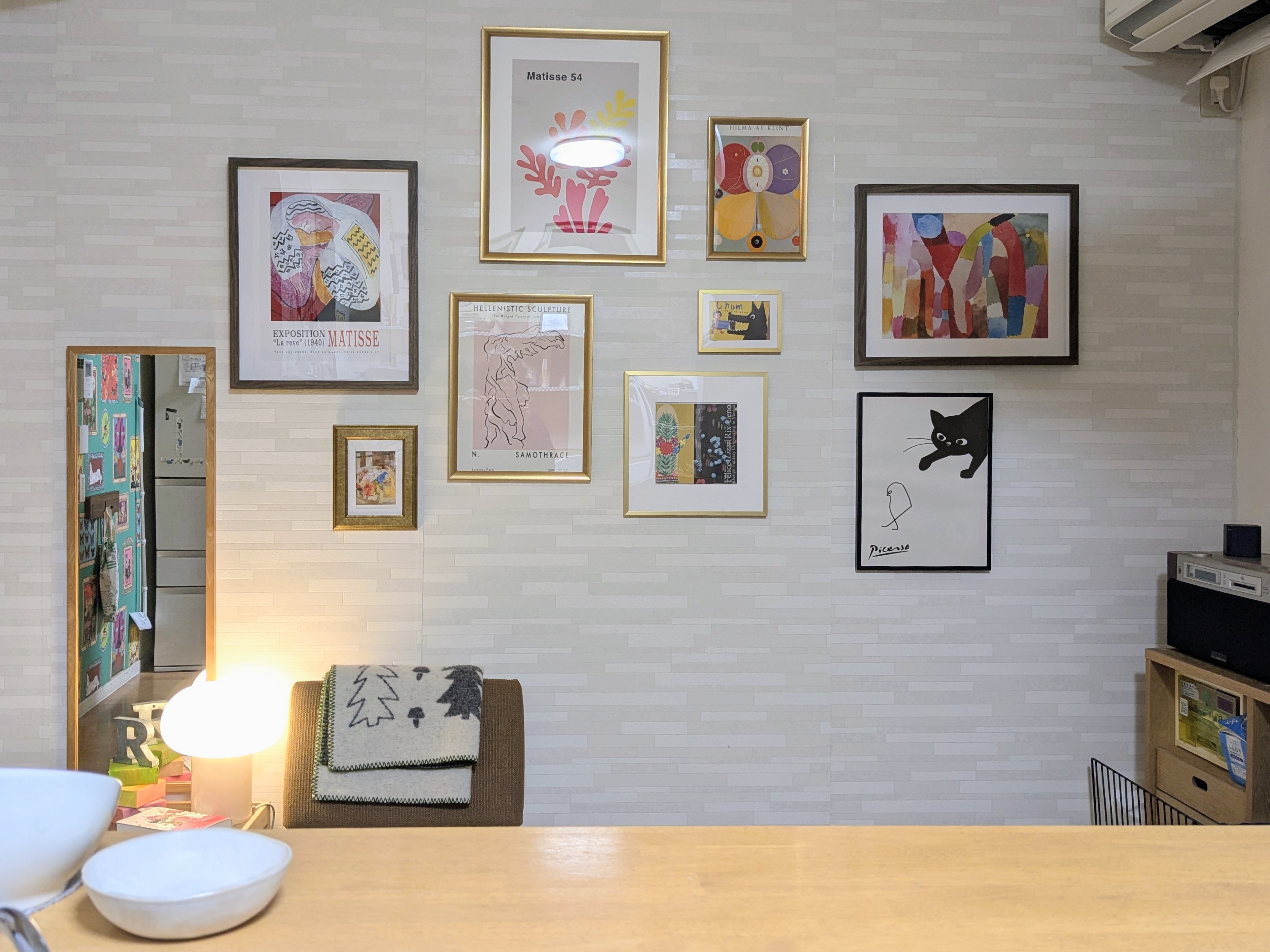 同時に壁紙も変えたいな〜と思いましたが、そこはよく考えてからにして、とりあえずキッチンに立つ時のテンションをあげるため、正面に見える壁にアートを飾ろうと思い好みの絵のポスターや、好きな画集の表紙、ポストカードなどを額に入れて、ギャラリーウォールにし、完璧なる自己満足状態を作り、毎日気分よくご飯を作ってます。